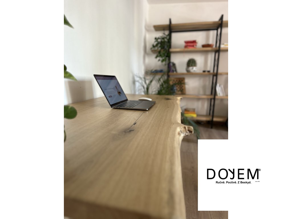 Masivní dubové police nesou jedinečný otisk přírody – suky, trhliny a drobné nedokonalosti zvýrazněné černým epoxidem nebo tmelem dodávají každému kusu osobitý charakter.